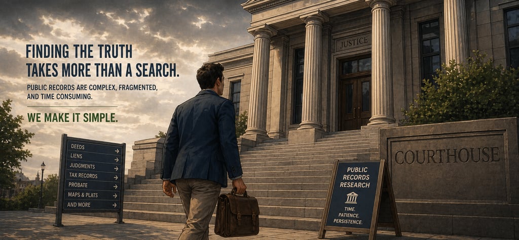 The practical limit of DIY: Online records are improving rapidly, but gaps remain. Older documents may only exist on microfilm or paper at the county office. Municipal liens don't appear in recorder records. Connecting all the dots into a coherent, defensible title report takes experience, knowing what a release looks like, what a defective deed looks like, and what's missing that should be there.
